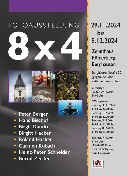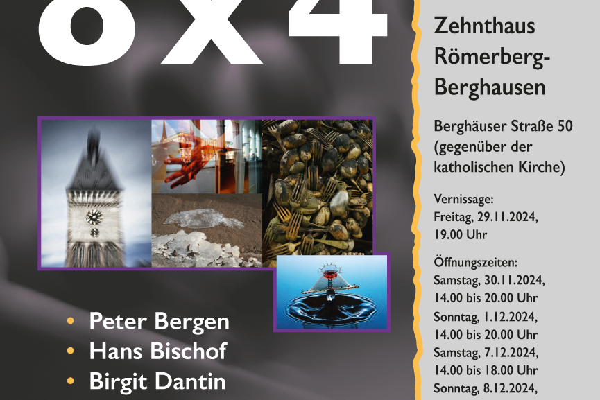 Zur Fotoausstellung 8 x 4 am Freitag, dem 29.11.2024, um 19 Uhr laden wir Sie, Ihre Familie und Freunde ins Zehnthaus, Berghäuser Str. 50 (gegenüber der katholischen Kirche) in Römerberg-Berghausen herzlich ein.
